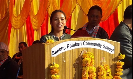 Kanchi, the first female graduate, speaks at the dedication